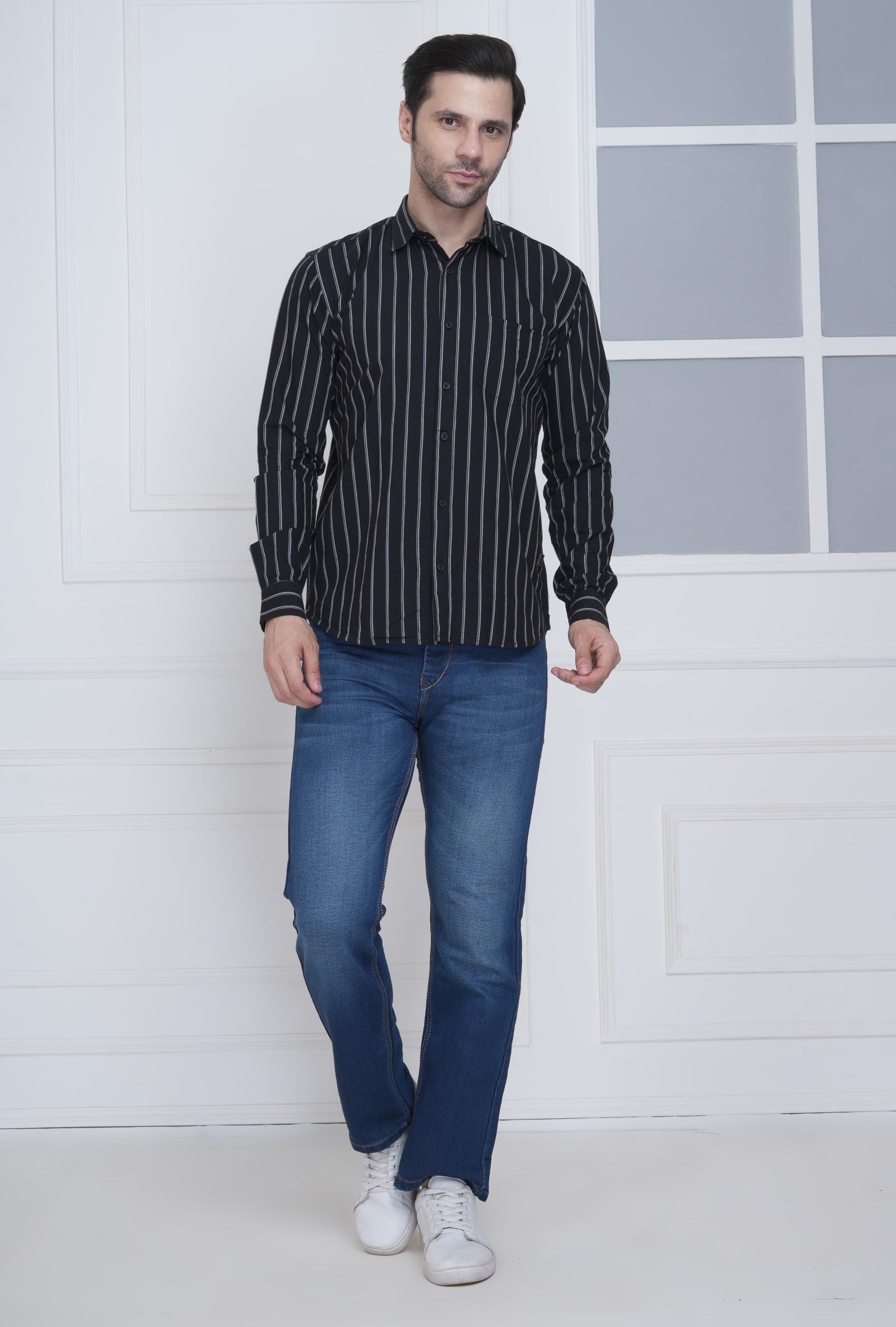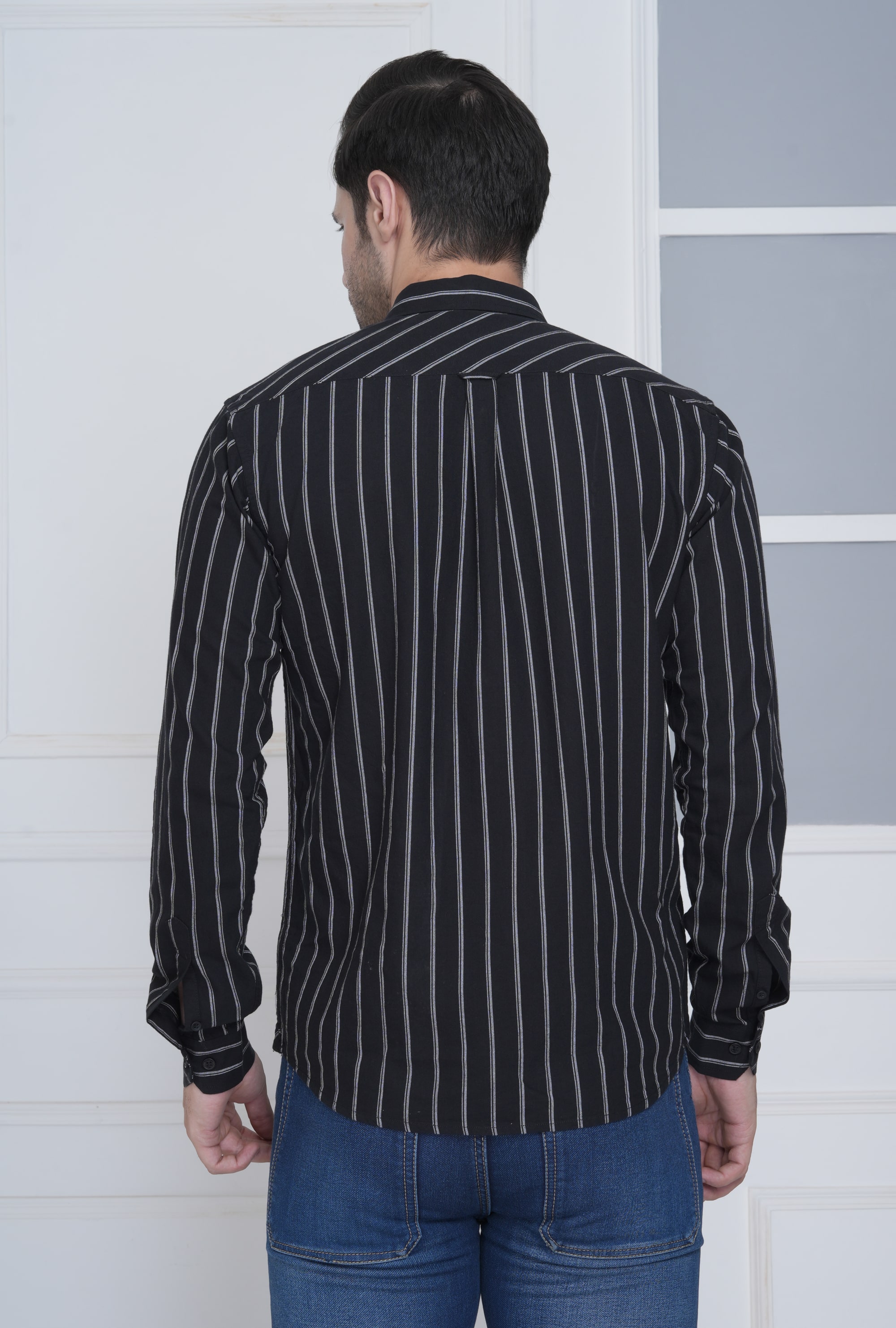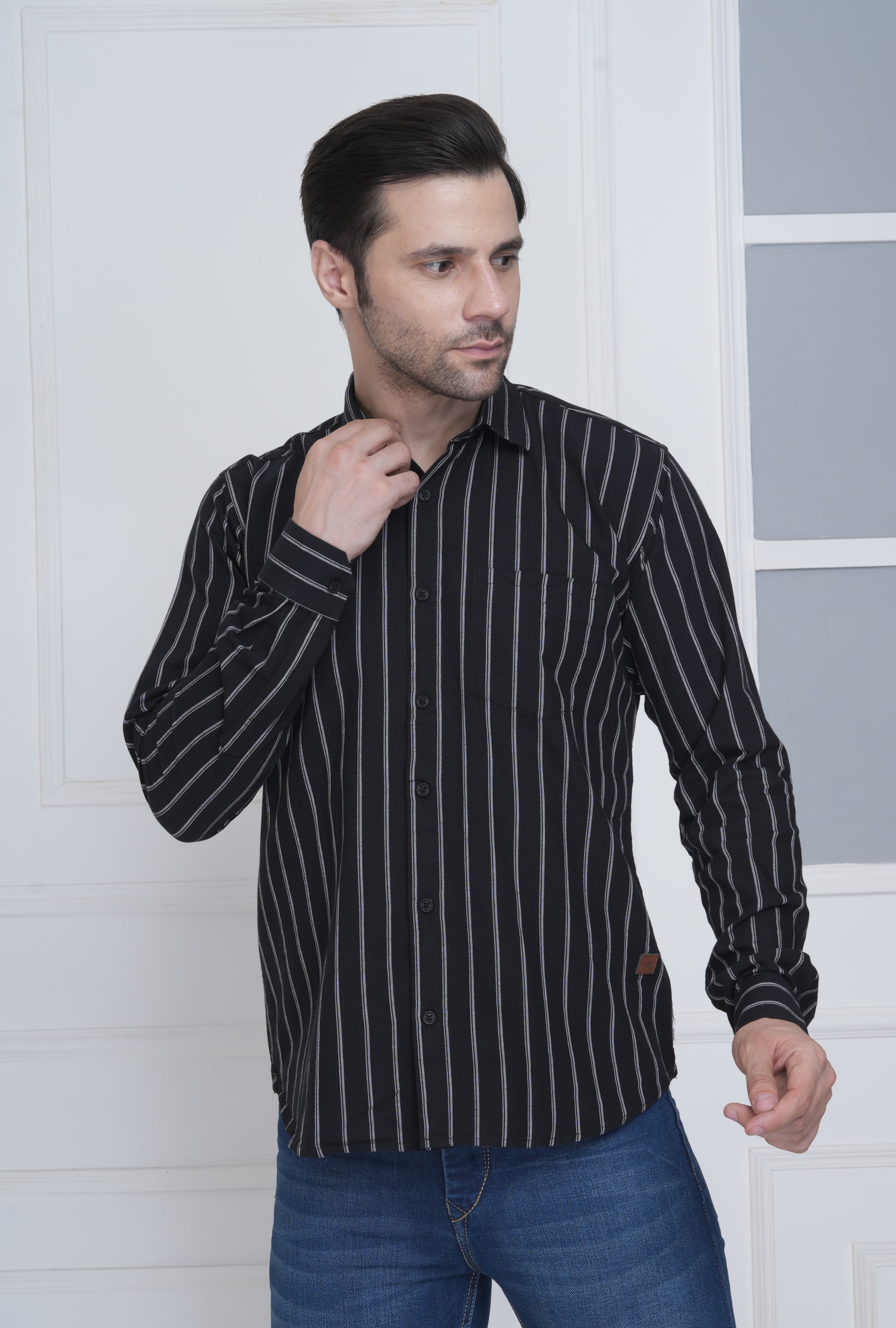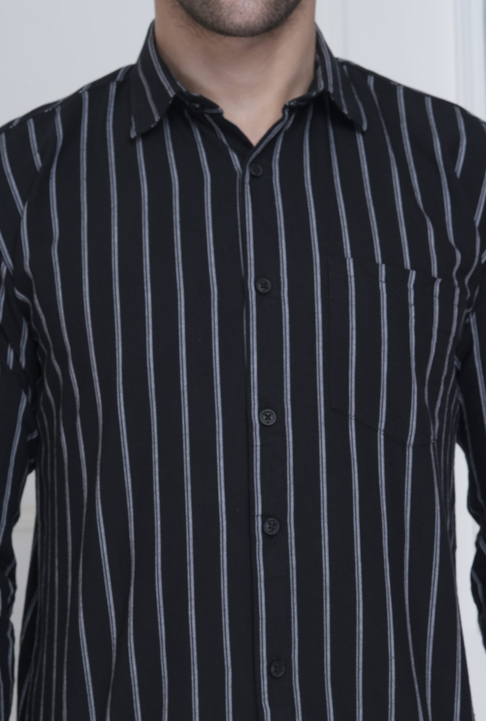 This black shirt with sharp white stripes creates a striking contrast for a stylish yet sophisticated look. Perfect for casual outings, office meetings, or evening gatherings.
