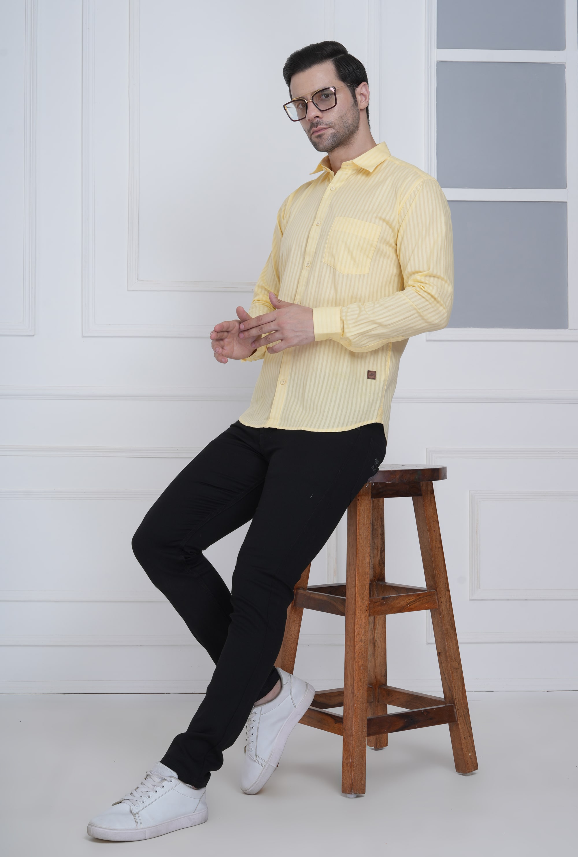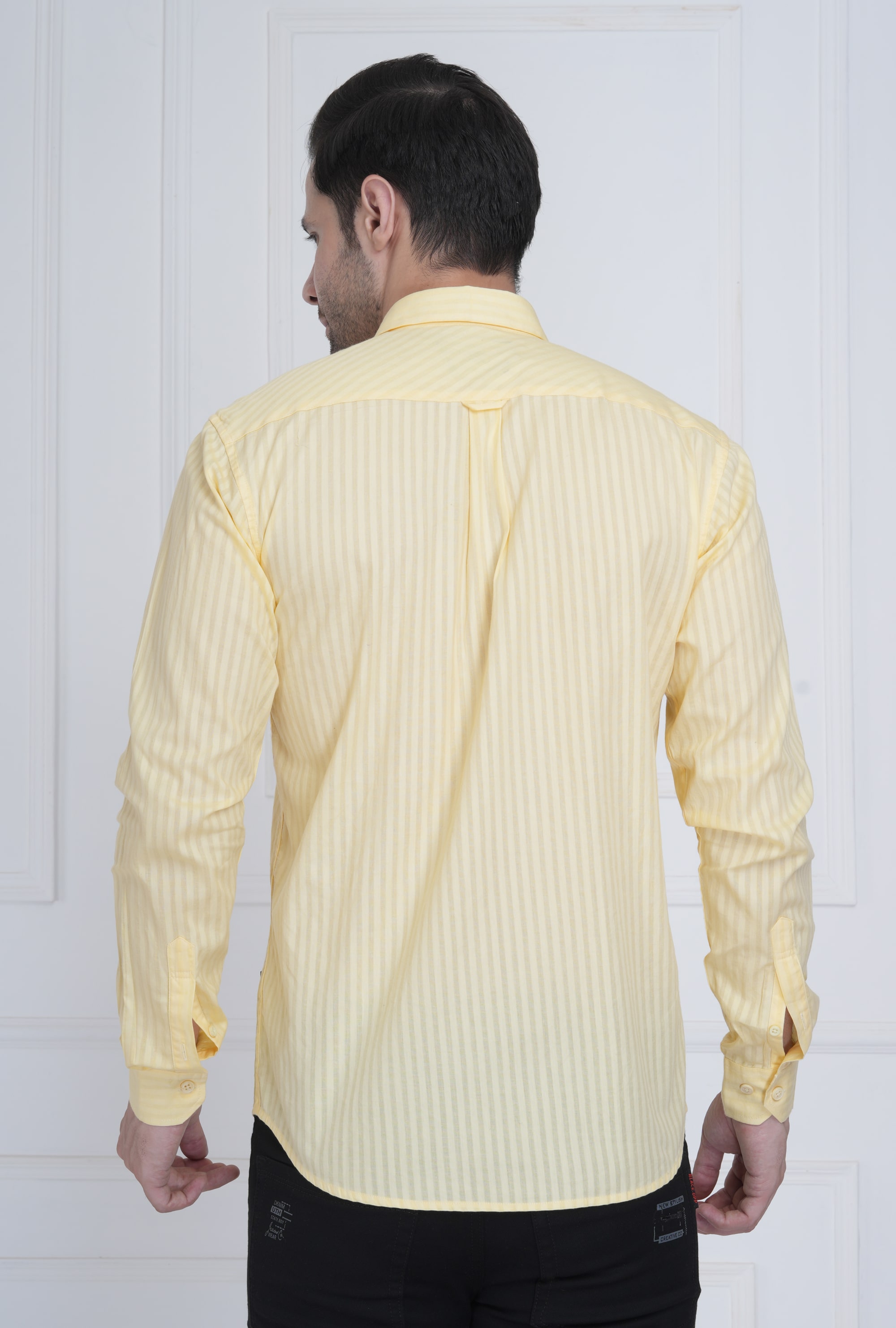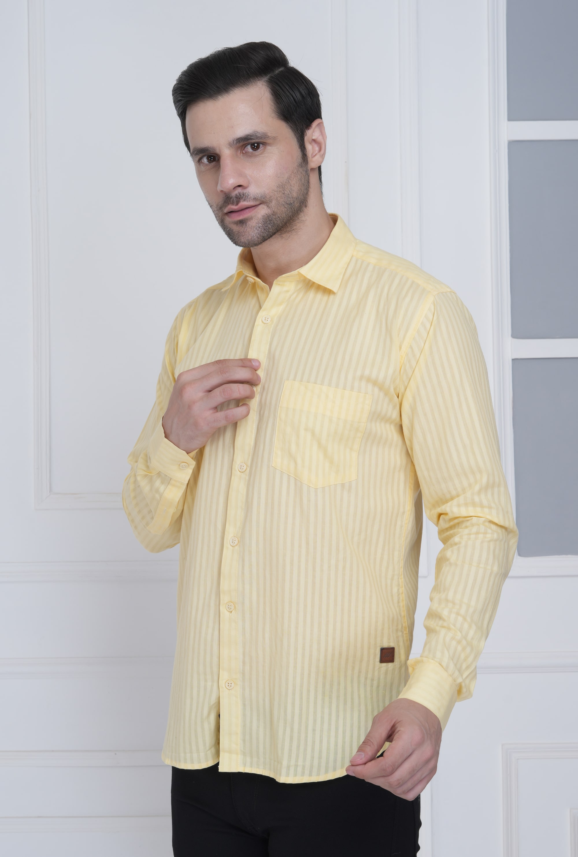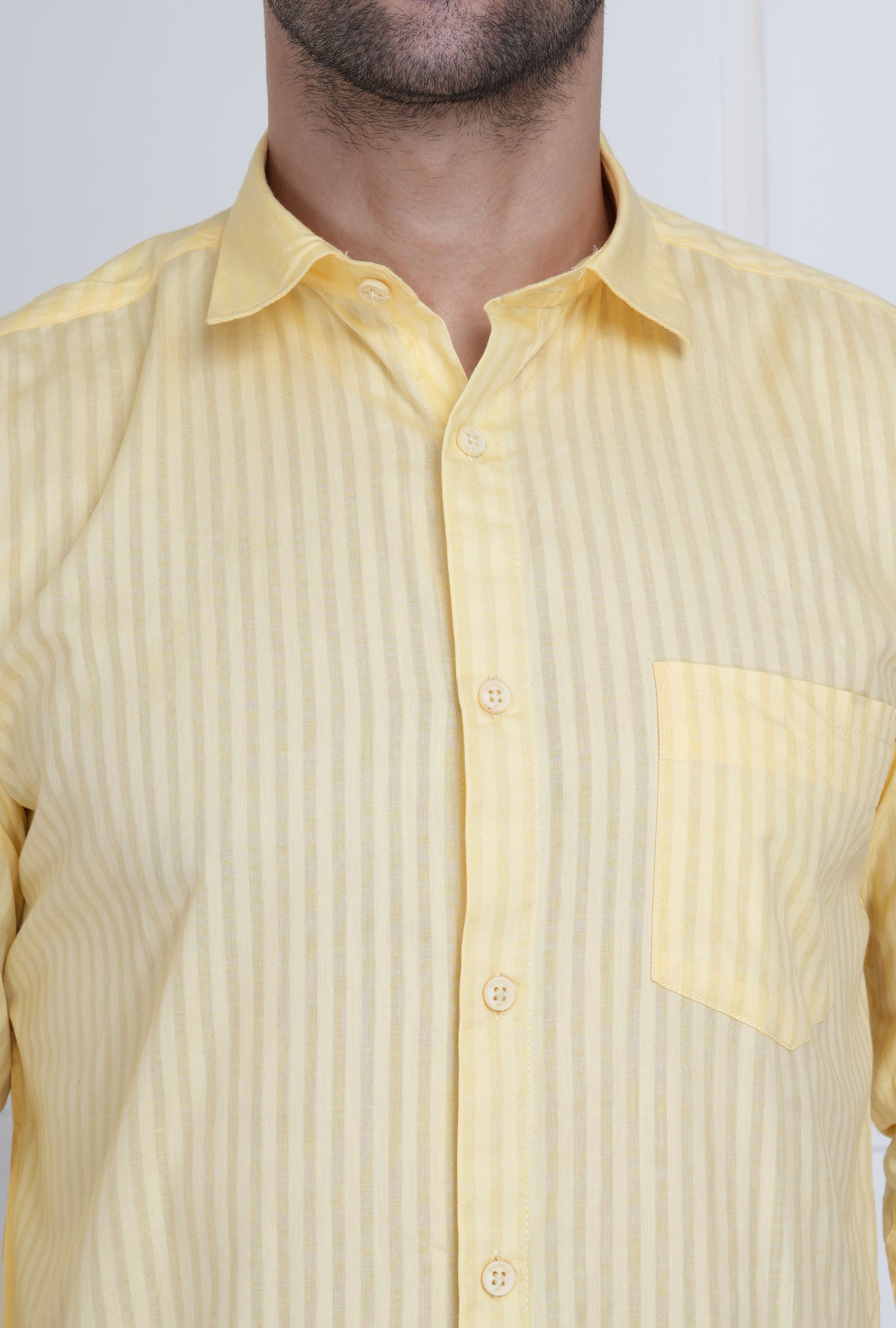 This lemon yellow shirt with subtle tonal vertical stripes adds a refined yet lively appeal. Ideal for office meetings, brunches, or weekend getaways with fresh sophistication.