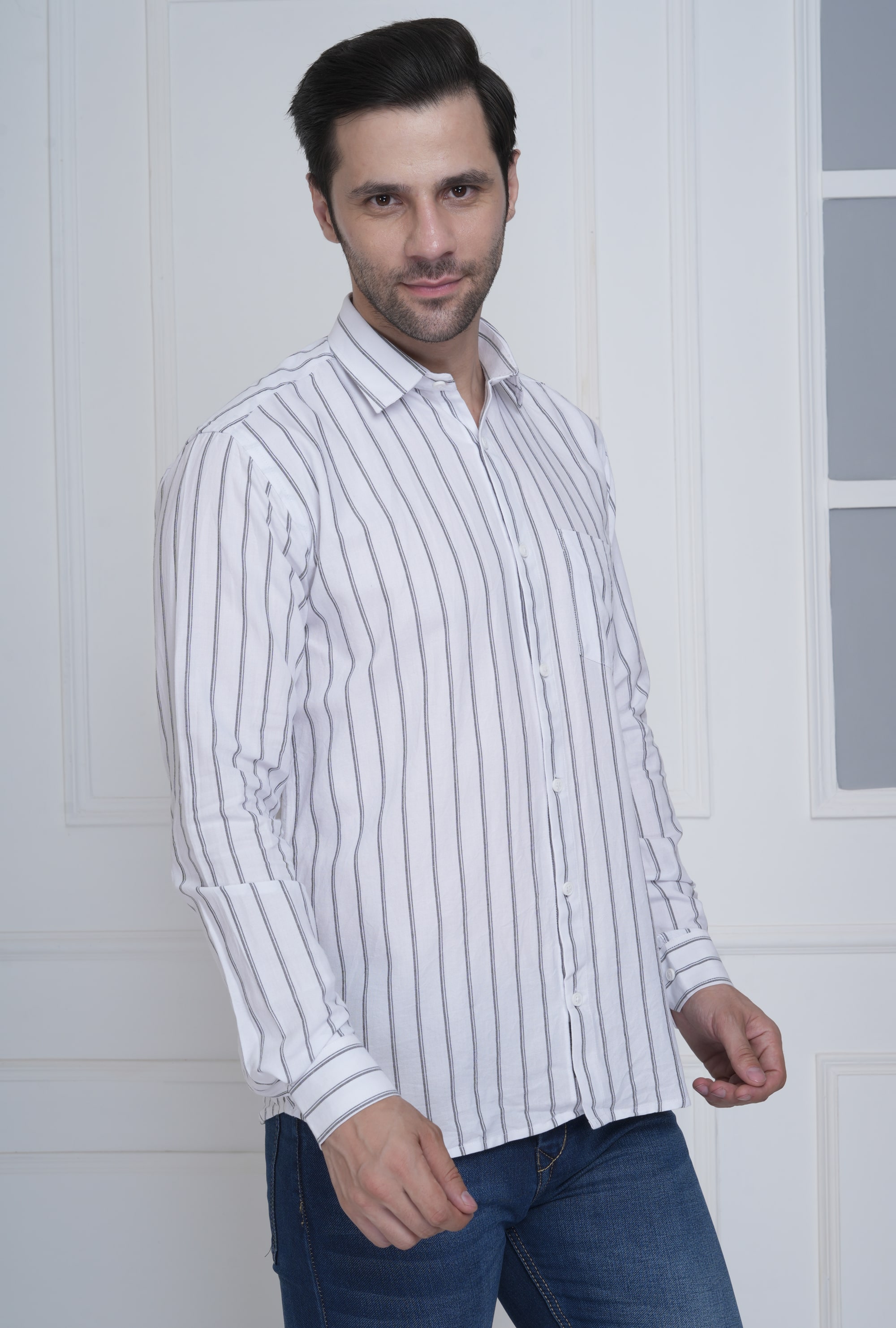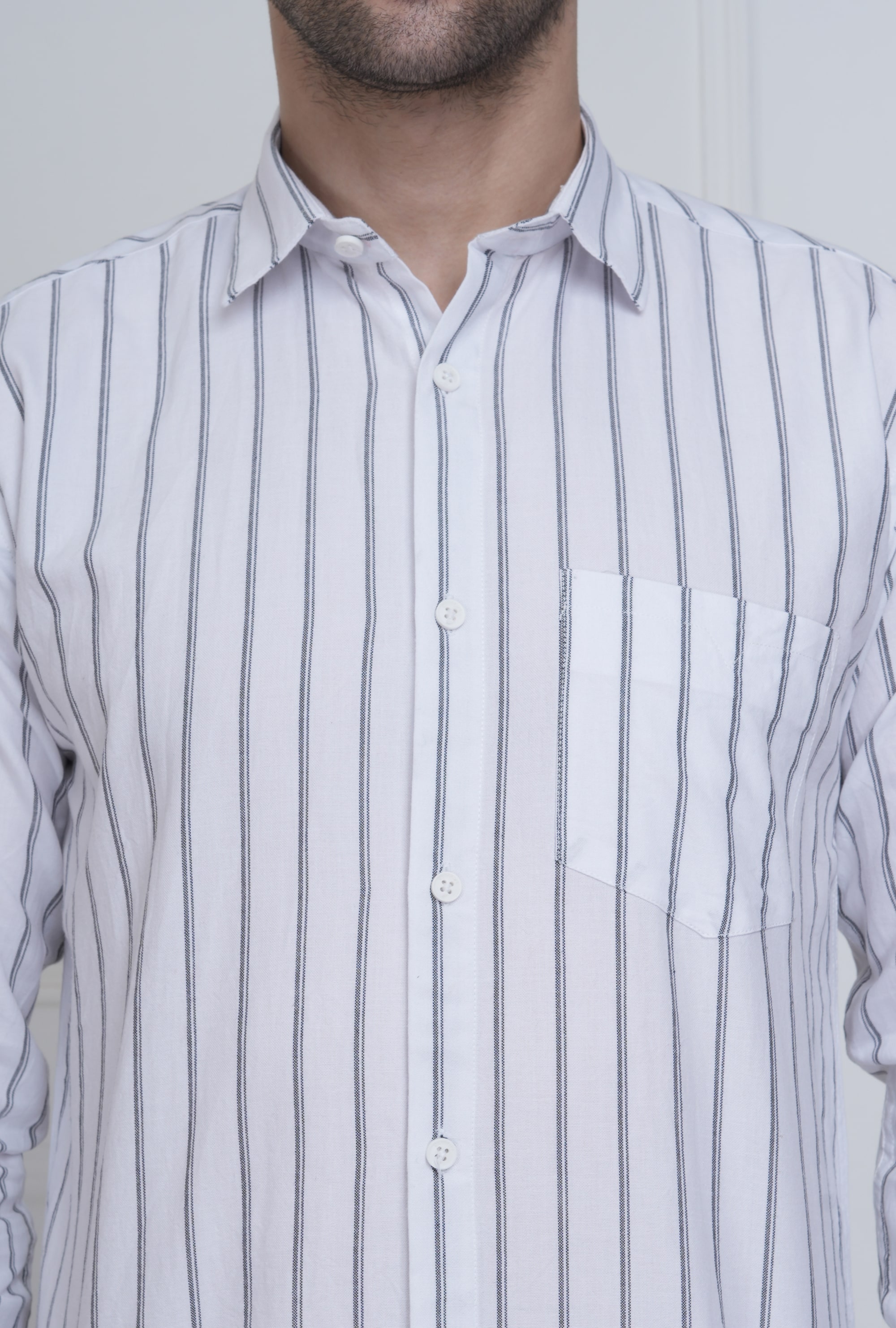 A light grey cotton shirt with crisp white stripes, blending modern aesthetics with timeless style. Perfectly versatile for casual Fridays, office meetings, or weekend outings.