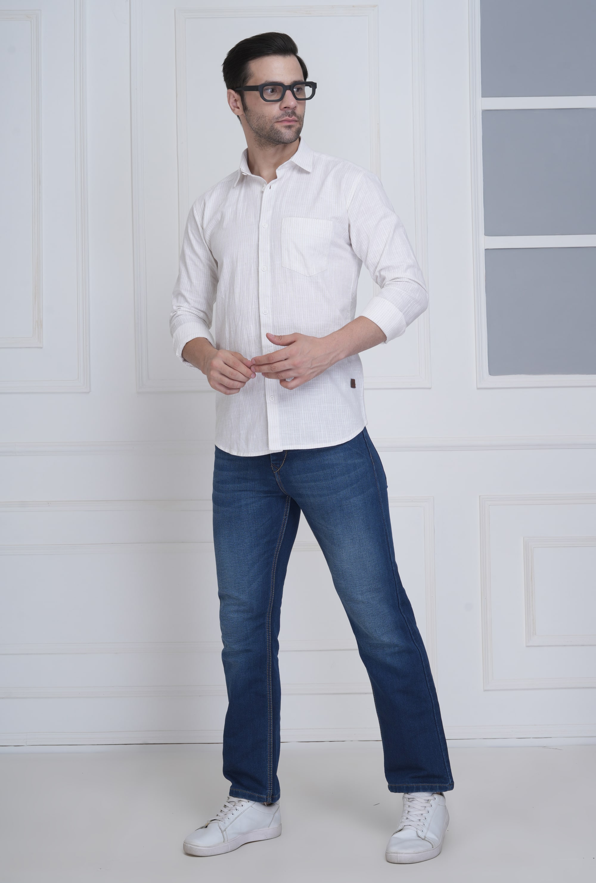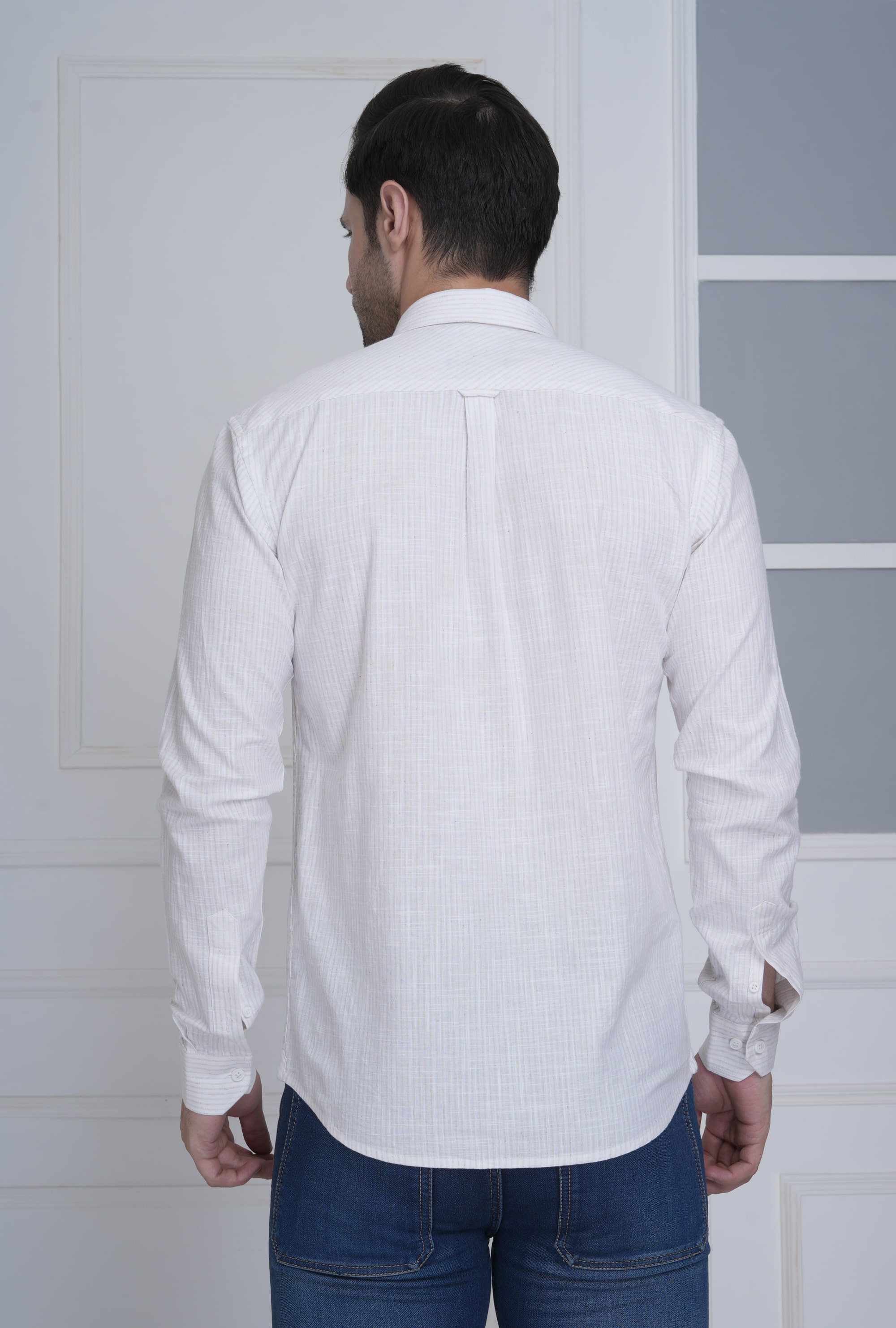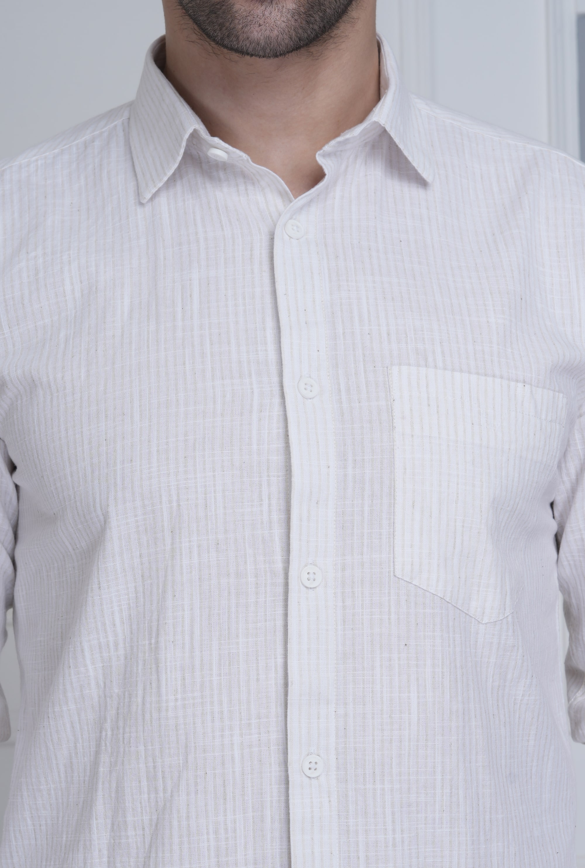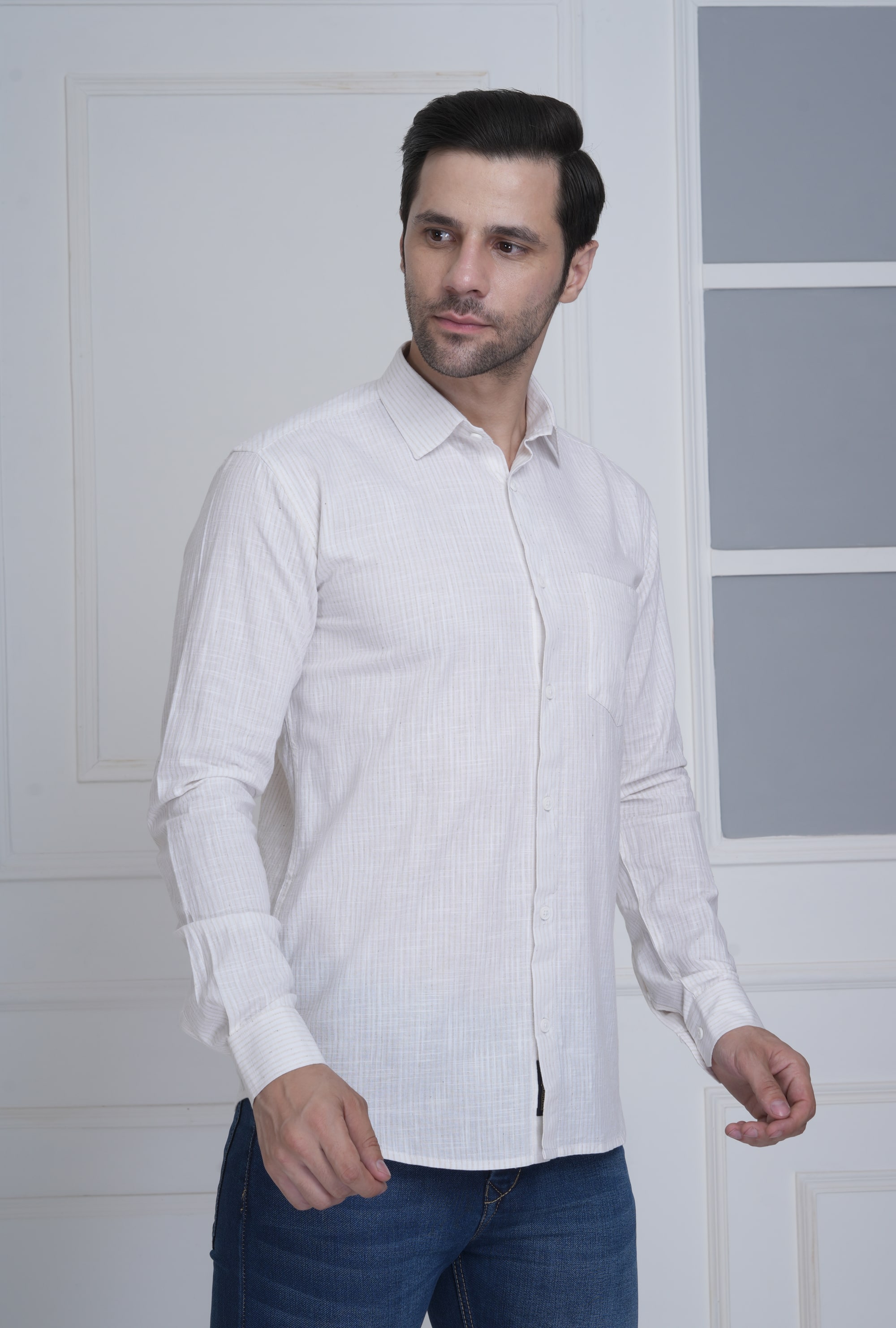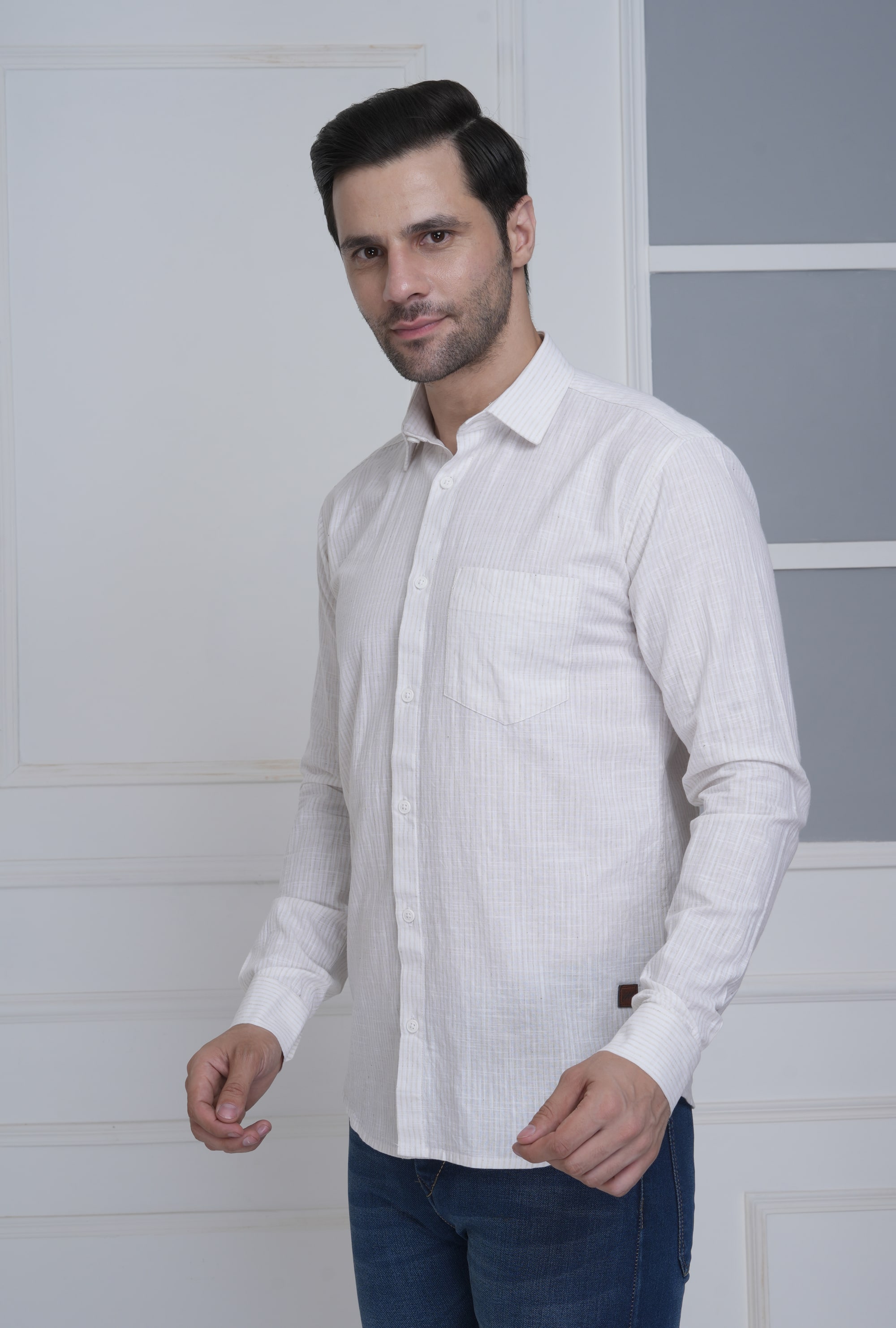 This soft beige linen shirt with subtle texture is breathable & comfortable for all-day wear. It's versatile design makes it perfect for office, casual outings & evening gatherings.